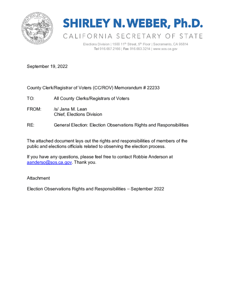 Elections Division | 1500 11th Street, 5th Floor | Sacramento, CA 95814 Tel 916.657.2166 | Fax 916.653.3214 | www.sos.ca.govSeptember 19, 2022County Clerk/Registrar of Voters (CC/ROV) Memorandum #
