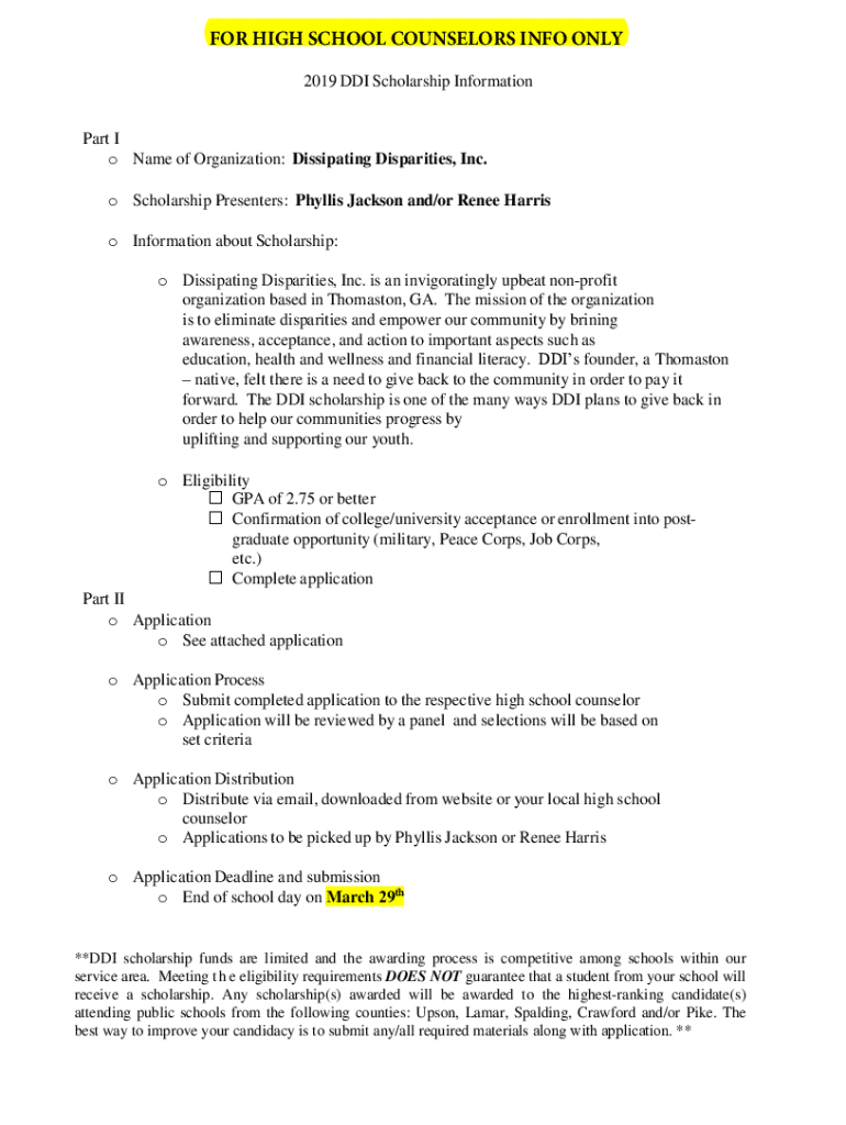 FOR HIGH SCHOOL COUNSELORS INFO ONLY 2019 DDI Scholarship Information Part I o Name of Organization: Dissipating Disparities, Inc. o Scholarship Presenters: Phyllis Jackson and/or Renee Harris o Information