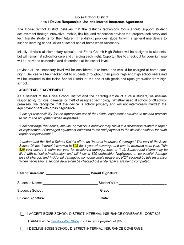 Boise School District 1 to 1 Device Responsible Use and Internal Insurance Agreement The Boise School District believes that the districts' technology focus should support student achievement through