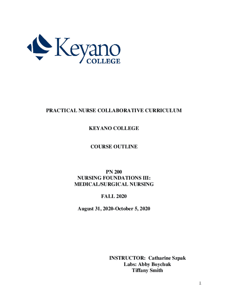 PRACTICAL NURSE COLLABORATIVE CURRICULUM KEY ANO COLLEGECOURSE OUTLINED 200 NURSING FOUNDATIONS III: MEDICAL/SURGICAL NURSING FALL 2020 August 31, 2020October 5, 2020INSTRUCTOR: Catherine Speak Labs: