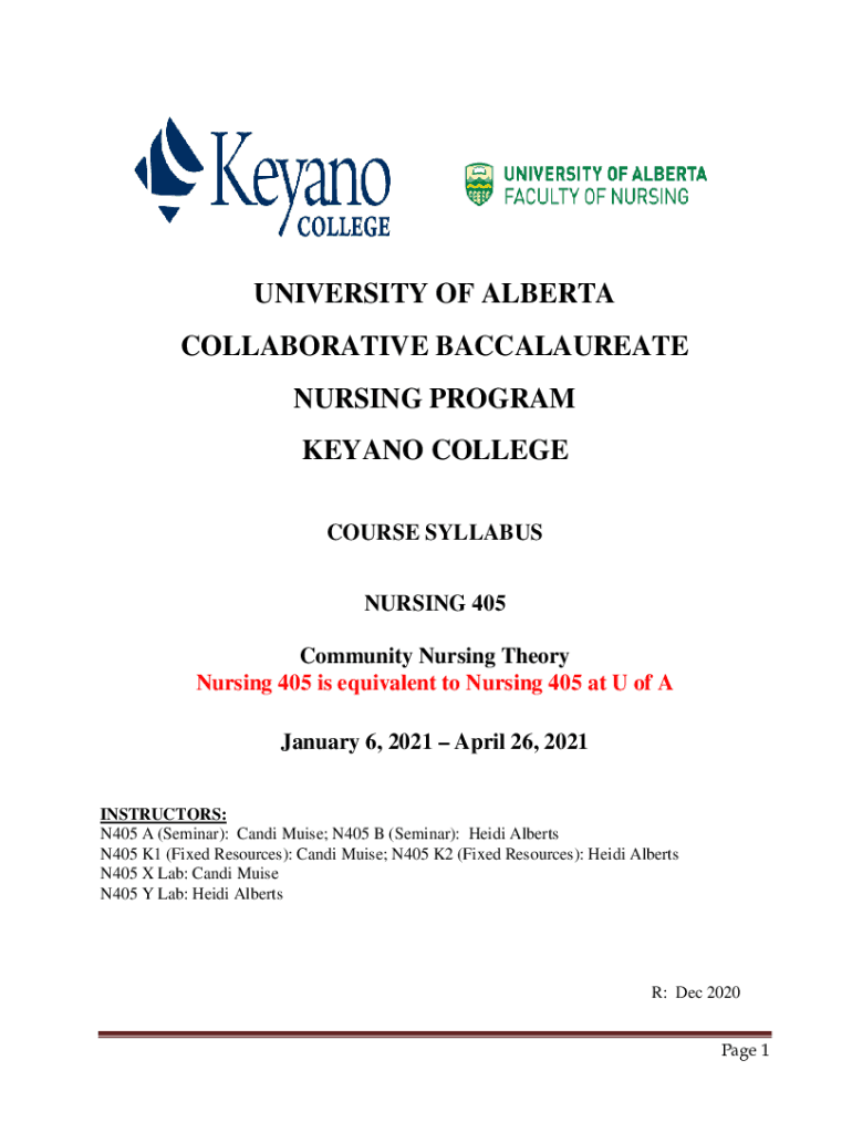 UNIVERSITY OF ALBERTA COLLABORATIVE BACCALAUREATE NURSING PROGRAM KEY ANO COLLEGE COURSE SYLLABUS NURSING 405 Community Nursing Theory Nursing 405 is equivalent to Nursing 405 at U of A January 6,