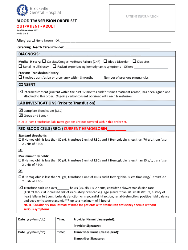 PATIENT INFORMATIONBLOOD TRANSFUSION ORDER SET OUTPATIENT ADULT As of November 2022 PAGE 1 of 3Allergies: None known OR ___ Referring Health Care Provider: ___DIAGNOSIS: ___ Medical History: Cardiac/Congestive
