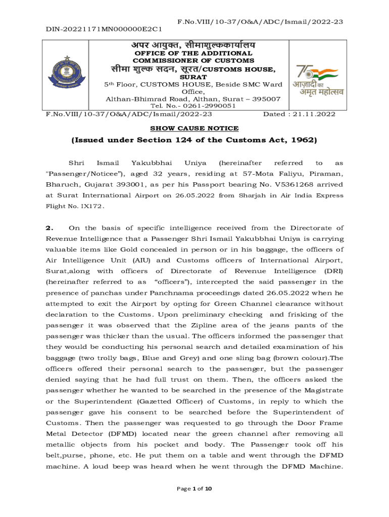 F. No.VIII/1037/O&A/ADC/Ismail/202223 DIN20221171MN000000E2C1, OFFICE OF THE ADDITIONAL COMMISSIONER OF CUSTOMS, /CUSTOMS HOUSE, SURAT TH 5 Floor, CUSTOMS HOUSE, Beside SMC Ward Office, AlthanBhimrad