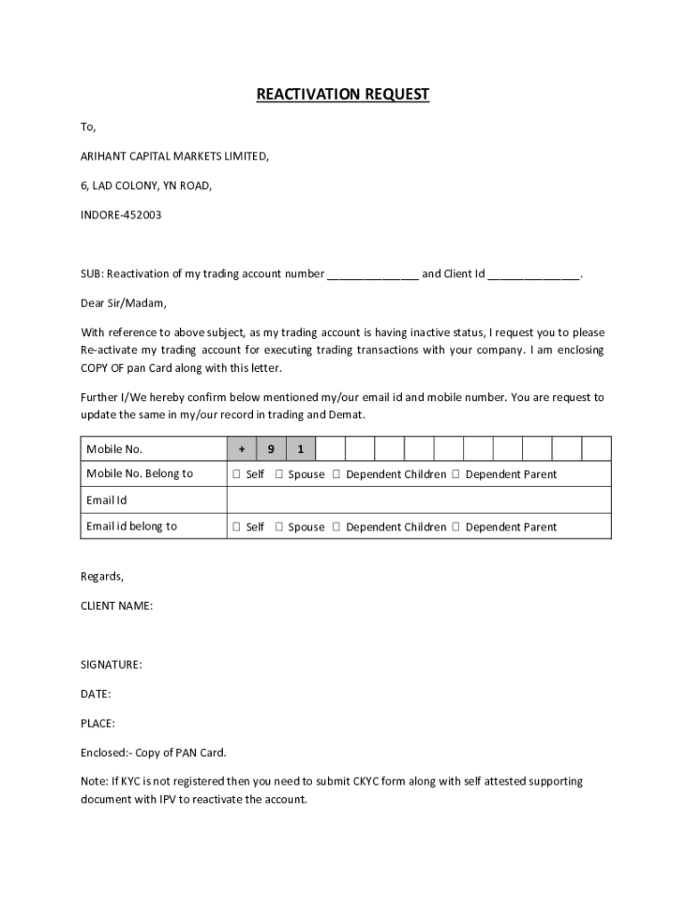 Get the free REACTIVATION REQUEST - Arihant Capital