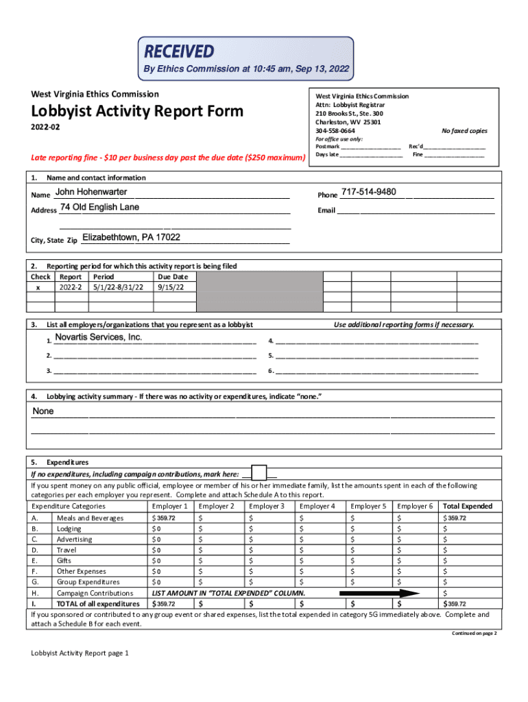 By Ethics Commission at 10:45 am, Sep 13, 2022West Virginia Ethics Commission West Virginia Ethics Commission Attn: Lobbyist Registrar 210 Brooks St., Ste. 300 Charleston, WV 25301 3045580664Lobbyist