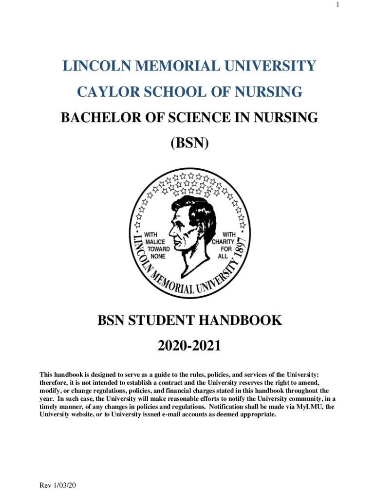 1LINCOLN MEMORIAL UNIVERSITY TAYLOR SCHOOL OF NURSING BACHELOR OF SCIENCE IN NURSING(BSN)BSN STUDENT HANDBOOK20202021 This handbook is designed to serve as a guide to the rules, policies, and services
