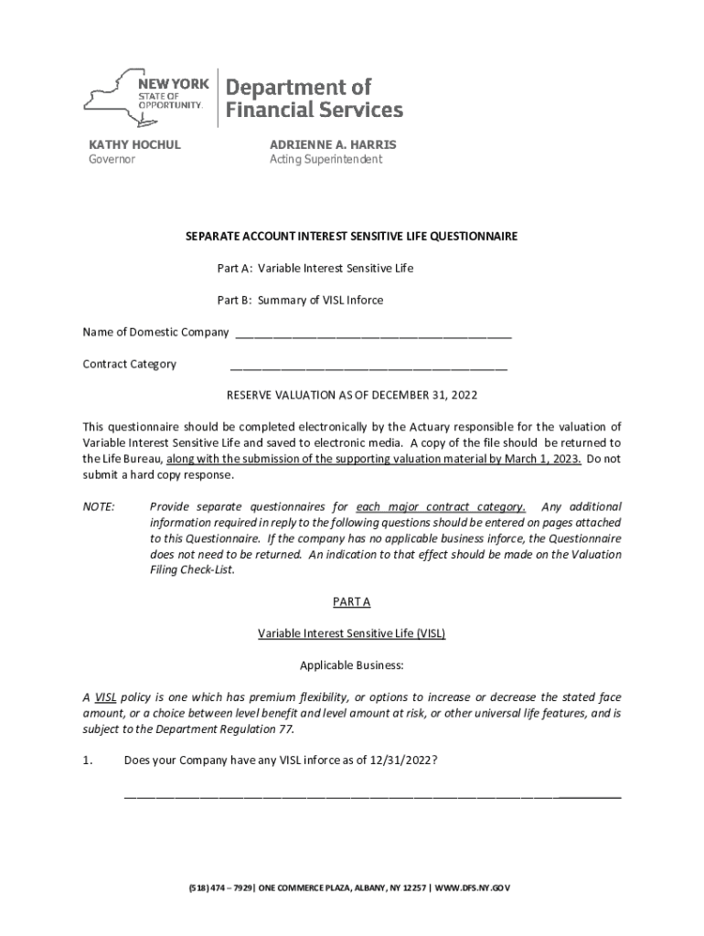 KATHY HOC HUL GovernorADRIENNE A. HARRIS Acting SuperintendentSEPARATE ACCOUNT INTEREST SENSITIVE LIFE QUESTIONNAIRE Part A: Variable Interest Sensitive Life Part B: Summary of VISA Enforce Name of
