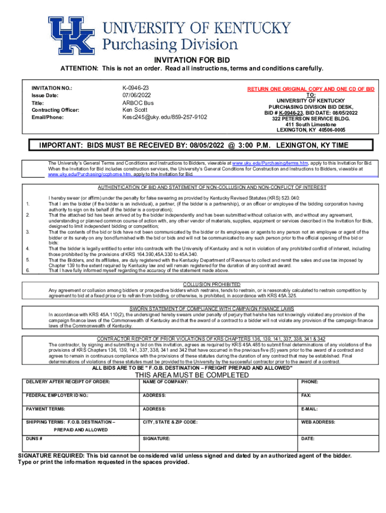 INVITATION FOR INATTENTION: This is not an order. Read all instructions, terms and conditions carefully. K094623 07/06/2022 ARBOR Bus Ken Scott Kesc245@uky.edu/8592579102INVITATION NO.: Issue Date: