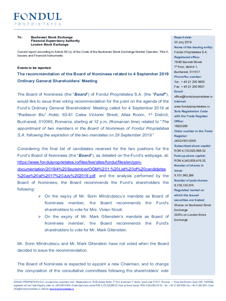 ___ To:Bucharest Stock Exchange Financial Supervisory Authority London Stock ExchangeReport date: 30 July 2019 Name of the issuing entity:Current report according to Article 99 (s) of the Code of