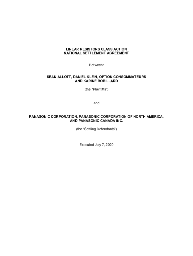 LINEAR RESISTORS CLASS ACTION NATIONAL SETTLEMENT AGREEMENT Between: SEAN ALCOTT, DANIEL KLEIN, OPTION CONSUMMATES AND MARINE ROBILLARD (the Plaintiffs)Panasonic CORPORATION, PANASONIC CORPORATION