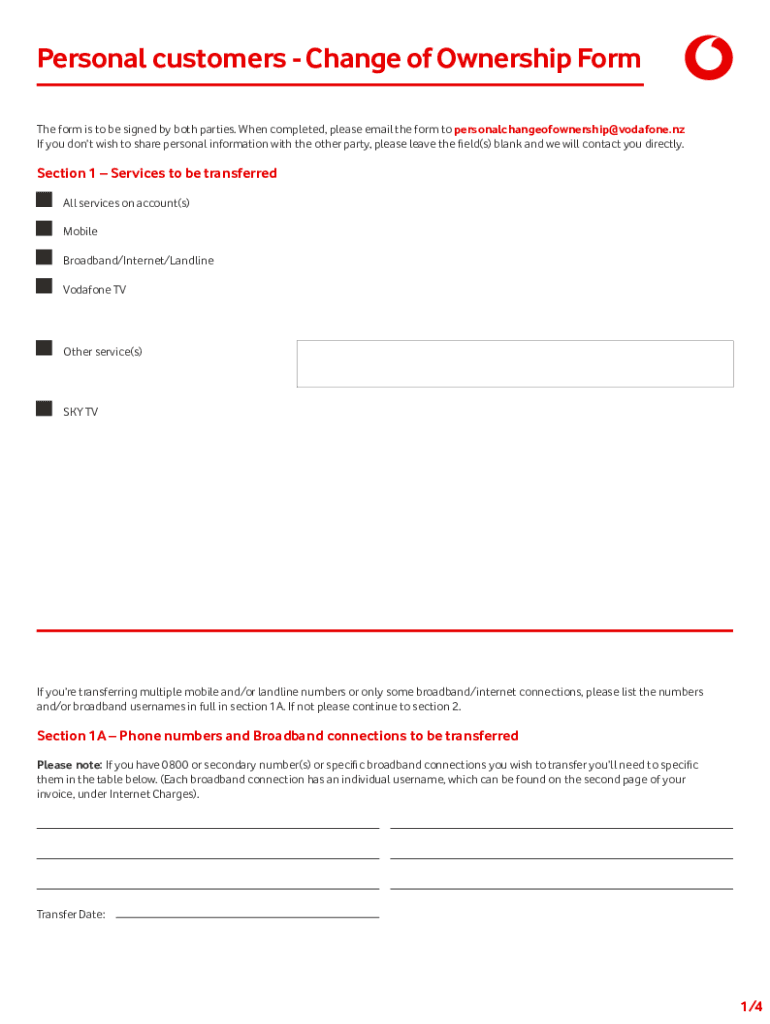 Personal customers Change of Ownership Form The form is to be signed by both parties. When completed, please email the form to personalchangeofownership@vodafone.nz If you don't wish to share personal