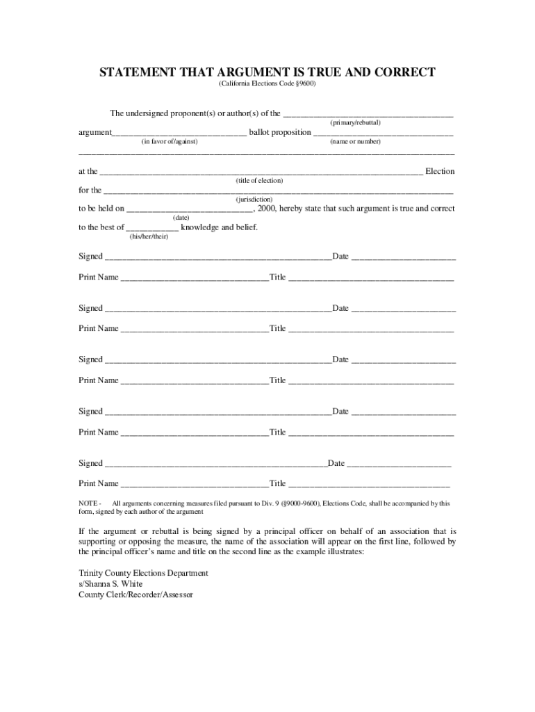 STATEMENT THAT ARGUMENT IS TRUE AND CORRECT (California Elections Code 9600)The undersigned proponent(s) or author(s) of the ___ (primary/rebuttal)argument___ ballot proposition ___ (in favor of/against)(name