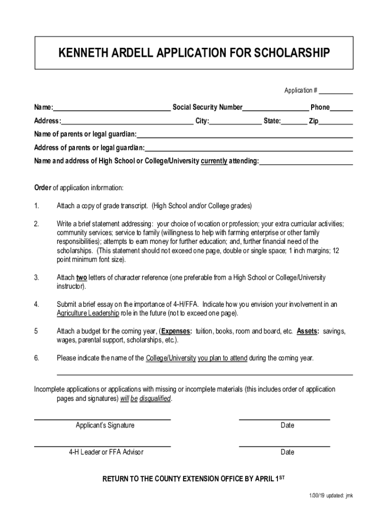 KENNETH ARIEL APPLICATION FOR SCHOLARSHIP Application #Name:Social Security NumberAddress:City:Phone State:Misname of parents or legal guardian: Address of parents or legal guardian: Name and address