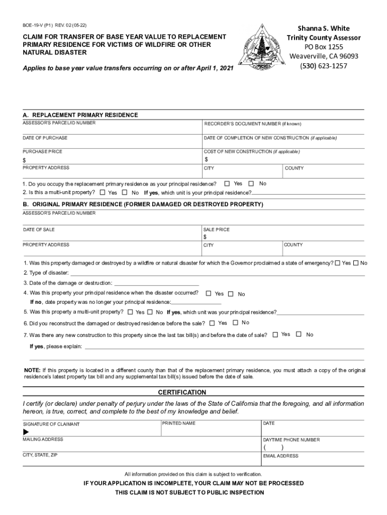 BOE19V (P1) REV. 02 (0522)Shanna S. White Trinity County Assessor PO Box 1255 Waterville, CA 96093 (530) 530) 6231257CLAIM FOR TRANSFER OF BASE YEAR VALUE TO REPLACEMENT PRIMARY RESIDENCE FOR VICTIMS
