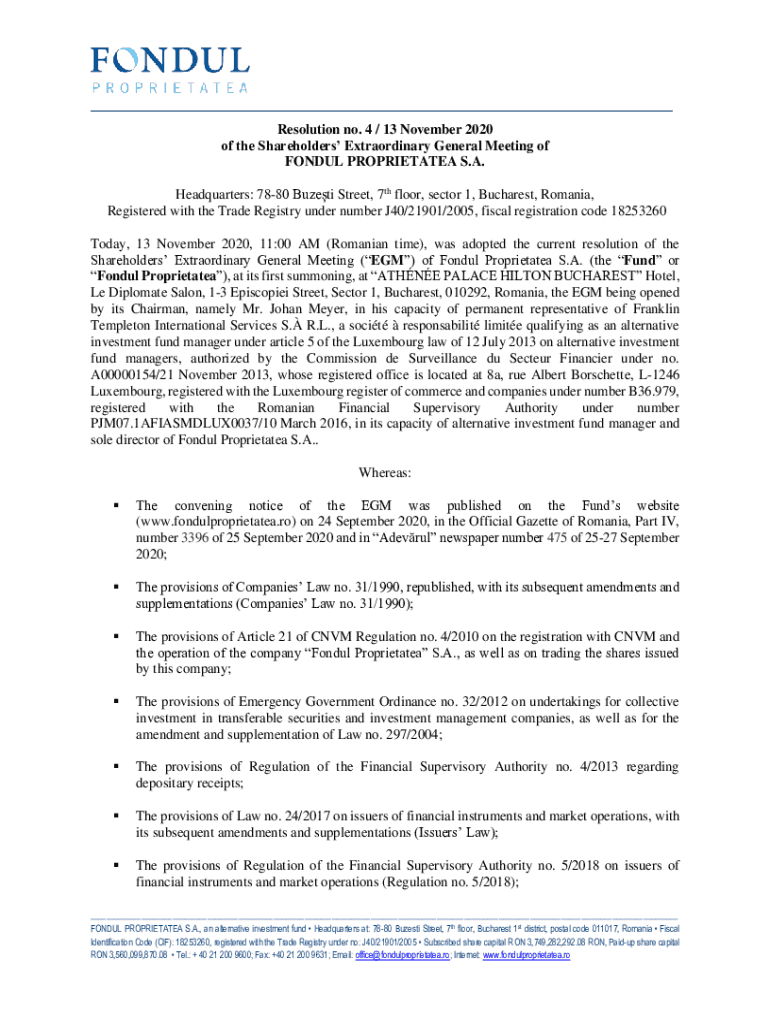 ___ Resolution no. 4 / 13 November 2020 of the Shareholders Extraordinary General Meeting of FONDUE PROPRIETARY S.A. Headquarters: 7880 Bizet Street, 7th floor, sector 1, Bucharest, Romania, Registered