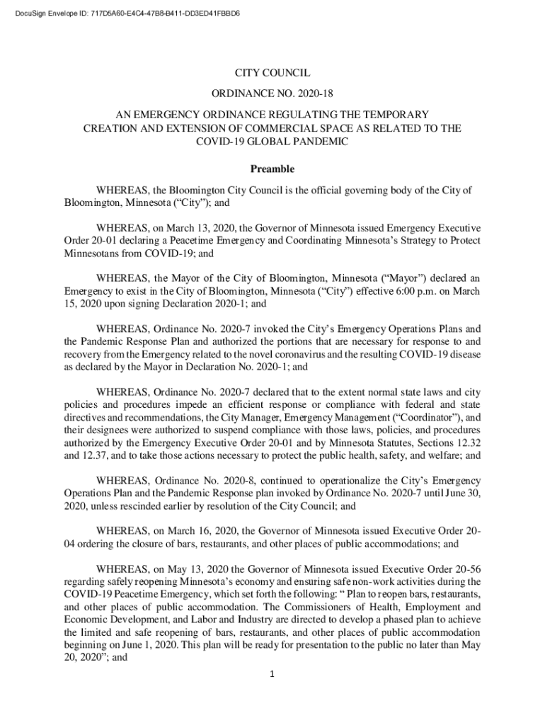 DocuSign Envelope ID: 717D5A60E4C447B8B411DD3ED41FBBD6CITY COUNCIL ORDINANCE NO. 202018 AN EMERGENCY ORDINANCE REGULATING THE TEMPORARY CREATION AND EXTENSION OF COMMERCIAL SPACE AS RELATED TO THE