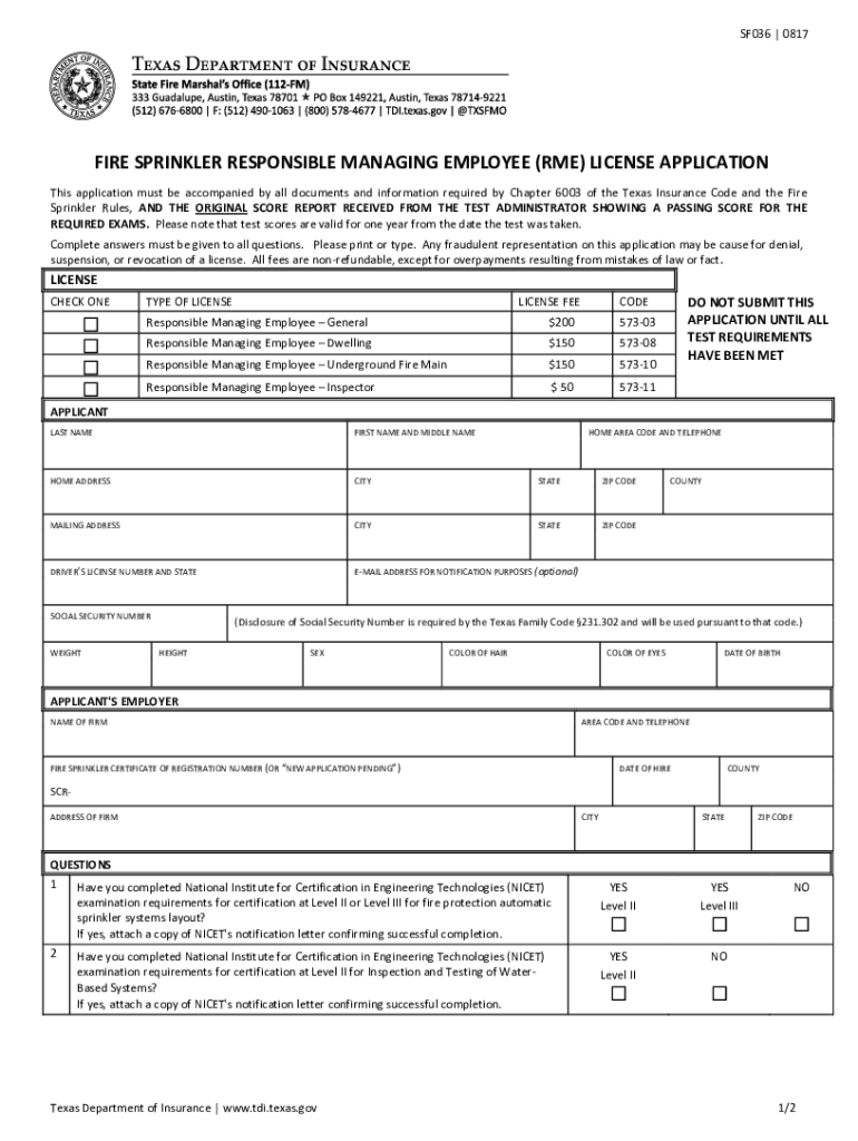 SF036 | 0817FIRE SPRINKLER RESPONSIBLE MANAGING EMPLOYEE (RME) LICENSE APPLICATION This application must be accompanied by all documents and information required by Chapter 6003 of the Texas Insurance