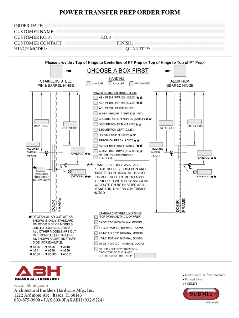 POWER TRANSFER PREP ORDER FORM ORDER DATE: CUSTOMER NAME: CUSTOMER P.O. #:CUSTOMER CONTACT: HINGE MODEL:S.O. #www.abhmfg.com Architectural Builders Hardware Mfg., Inc. 1222 Ardmore Ave., Itasca, IL