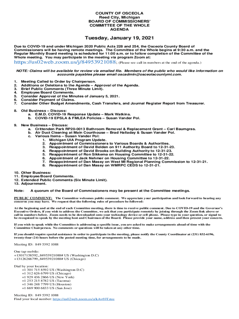COUNTY OF OSCEOLA Reed City, Michigan BOARD OF COMMISSIONERS COMMITTEE OF THE WHOLE AGENDA Tuesday, January 19, 2021, Due to COVID-19 and under Michigan 2020 Public Acts 228 and 254, the Osceola County