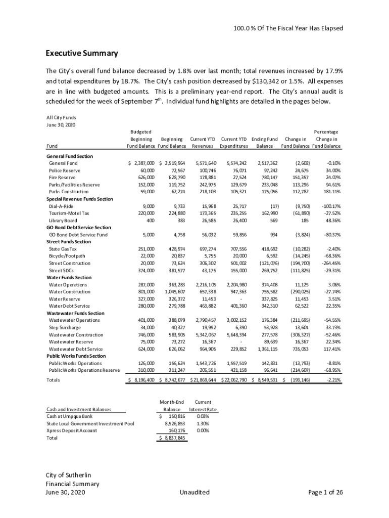 100.0%OfTheFiscalYearHasElapsedExecutiveSummary TheCitysoverallfundbalancedecreasedby1.8%overlastmonth;totalrevenuesincreasedby17.9% andtotalexpendituresby18.7%. TheCityscashpositiondecreasedby$130,342or1.5%.