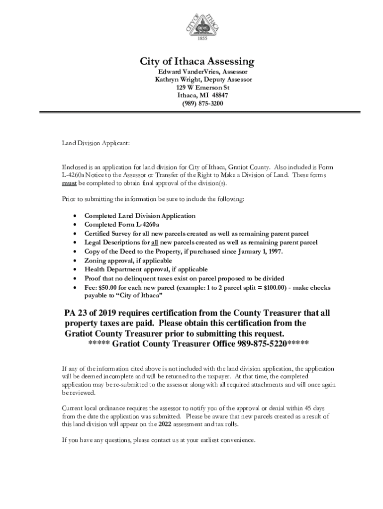 City of Ithaca Assessing Edward VanderVries, Assessor Kathryn Wright, Deputy Assessor 129 W Emerson St Ithaca, MI 48847 (989) 8753200Land Division Applicant: Enclosed is an application for land division