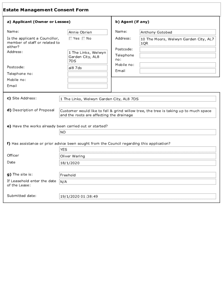Estate Management Consent Form a) Applicant (Owner or Lessee)b) Agent (if any)Name:Annie Orientate:Anthony Hotbeds the applicant a Councillor, member of staff or related to either?c Yes g d e f g