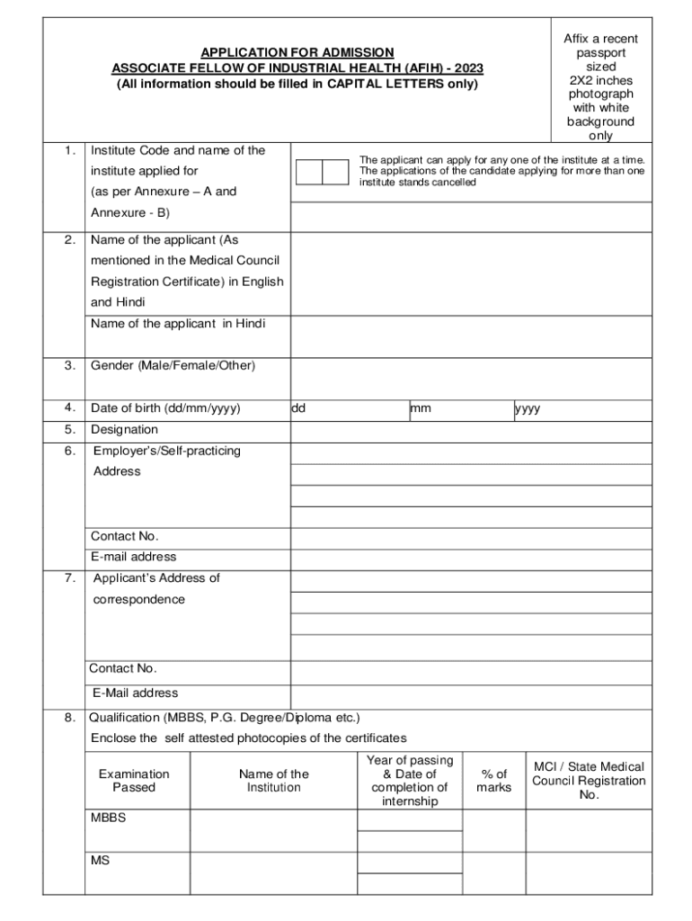 Affix a recent passport sized 2×2 inches photograph with white background onlyAPPLICATION FOR ADMISSION ASSOCIATE FELLOW OF INDUSTRIAL HEALTH (AFH) 2023 (All information should be filled in CAPITAL