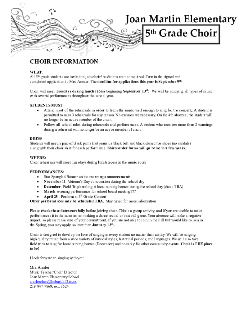 Joan Martin Elementary 5th Grade Choir INFORMATIONAL: All 5th grade students are invited to join choir! Auditions are not required. Turn in the signed and completed application to Mrs. Ampler. The
