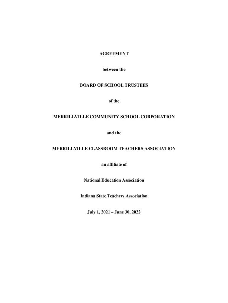 AGREEMENT between deboard OF SCHOOL TRUSTEES of Merrillville COMMUNITY SCHOOL CORPORATION and Merrillville CLASSROOM TEACHERS ASSOCIATION an affiliate national Education Association Indiana State