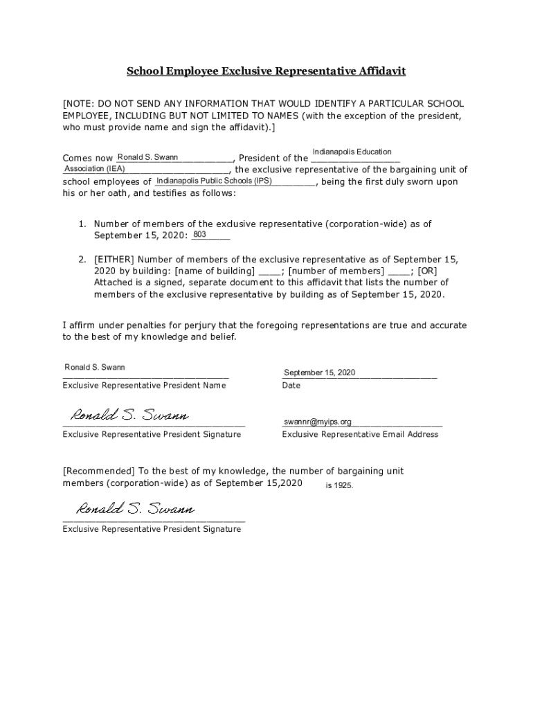 School Employee Exclusive Representative Affidavit [NOTE: DO NOT SEND ANY INFORMATION THAT WOULD IDENTIFY A PARTICULAR SCHOOL EMPLOYEE, INCLUDING BUT NOT LIMITED TO Name (except the president, who