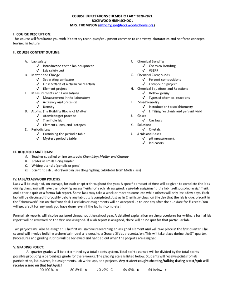 COURSE EXPECTATIONS CHEMISTRY LAB 20202021 LOCKWOOD HIGH SCHOOL MRS. THOMPSON (mthompson@rockwoodschools.org) I. COURSE DESCRIPTION: This course will familiarize you with laboratory techniques/equipment