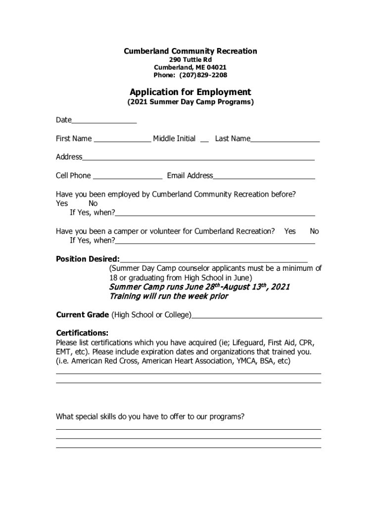 Cumberland Community Recreation 290 Turtle Rd Cumberland, ME 04021 Phone: (207)8292208Application for Employment(2021 Summer Day Camp Programs)Date___ First Name ___ Middle Initial __ Last Name___