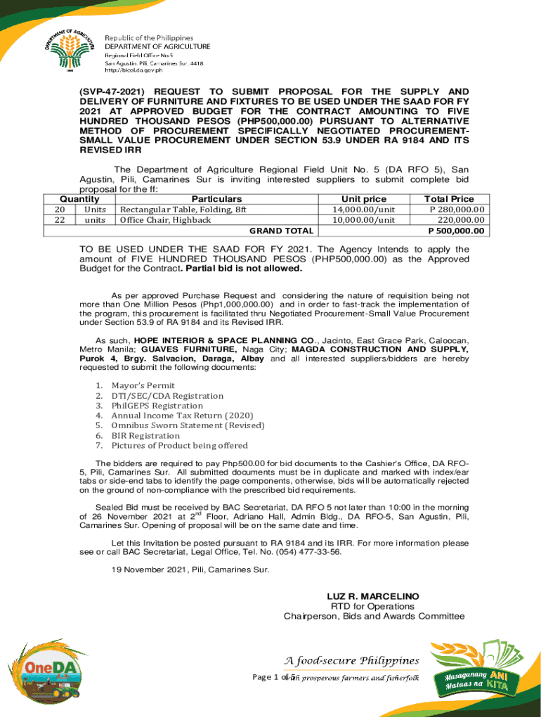 (SVP472021) REQUEST TO SUBMIT PROPOSAL FOR THE SUPPLY AND DELIVERY OF FURNITURE AND FIXTURES TO BE USED UNDER THE SAID FOR FY 2021 AT APPROVED BUDGET FOR THE CONTRACT AMOUNTING TO FIVE HUNDRED THOUSAND
