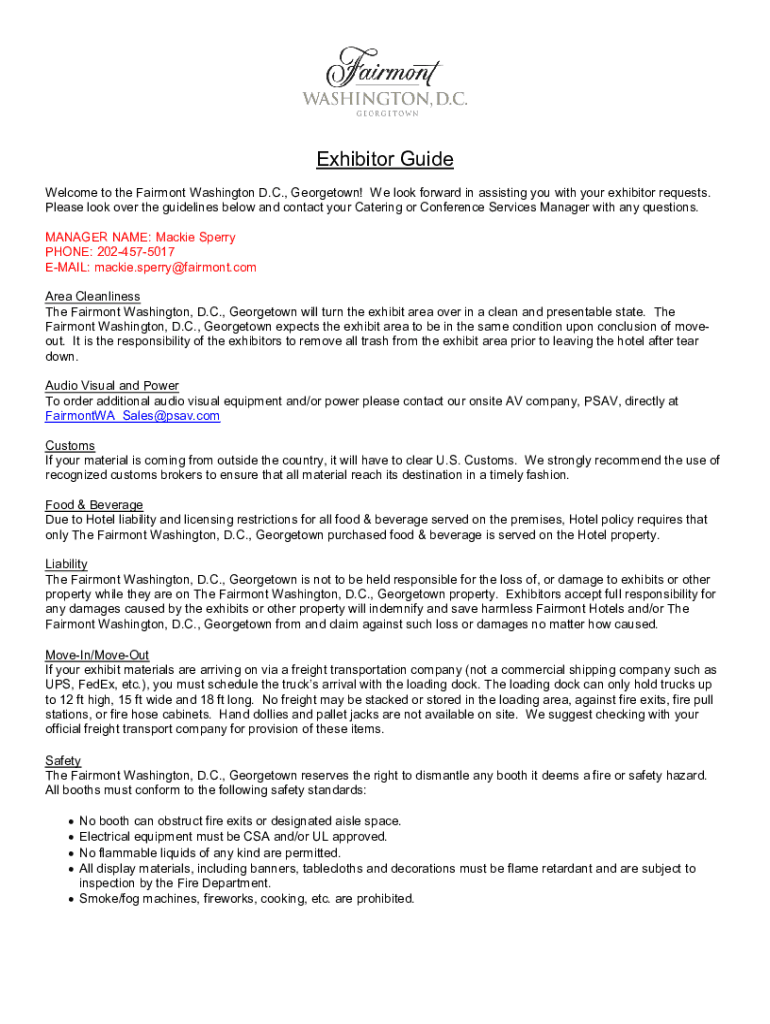 Exhibitor Guide Welcome to the Fairmont Washington D.C., Georgetown! We look forward in assisting you with your exhibitor requests. Please look over the guidelines below and contact your Catering