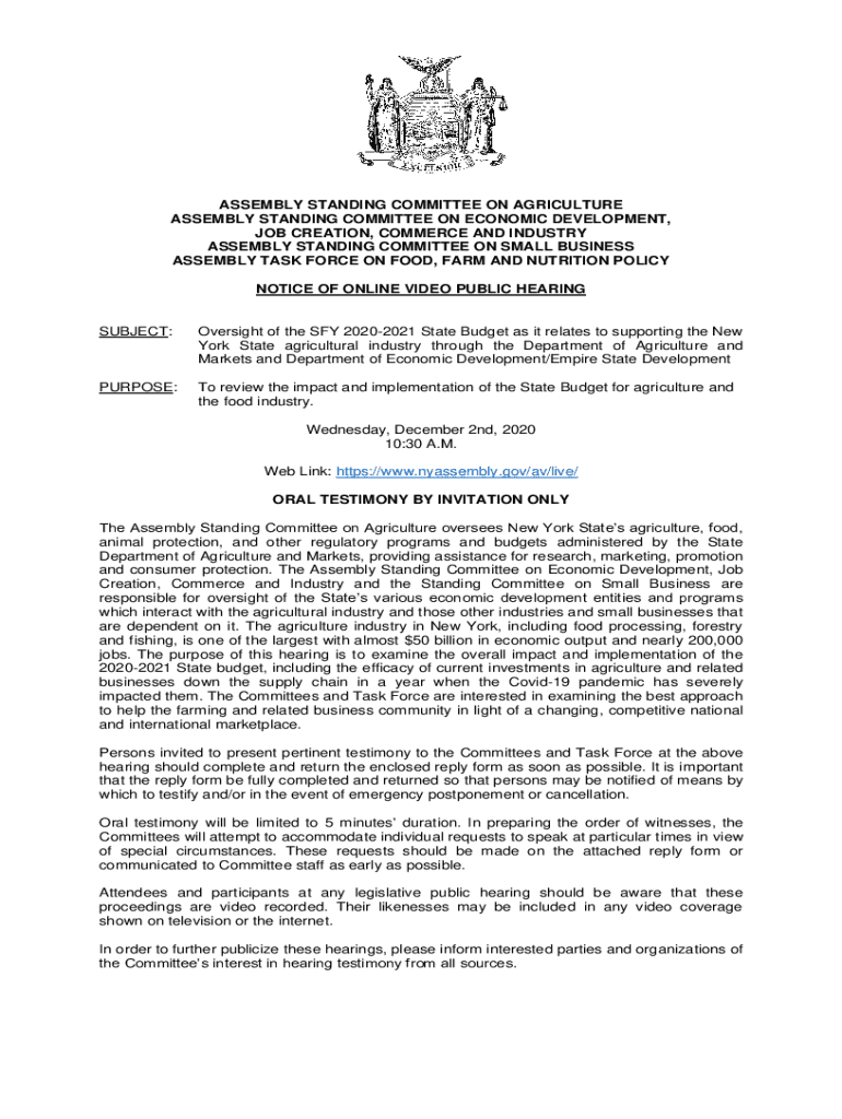 ASSEMBLY STANDING COMMITTEE ON AGRICULTURE ASSEMBLY STANDING COMMITTEE ON ECONOMIC DEVELOPMENT, JOB CREATION, COMMERCE AND INDUSTRY ASSEMBLY STANDING COMMITTEE ON SMALL BUSINESS ASSEMBLY TASK FORCE