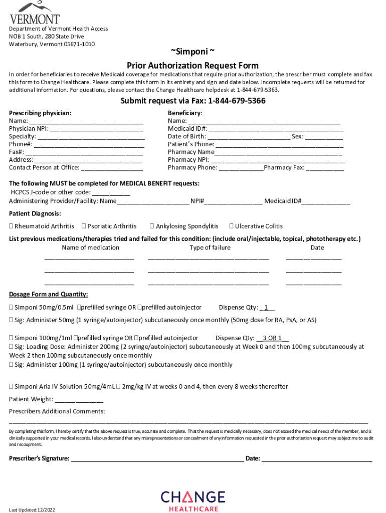 Department of Vermont Health Access NOB 1 South, 280 State Drive Waterbury, Vermont 056711010Simponi Prior Authorization Request Forming order for beneficiaries to receive Medicaid coverage for medications
