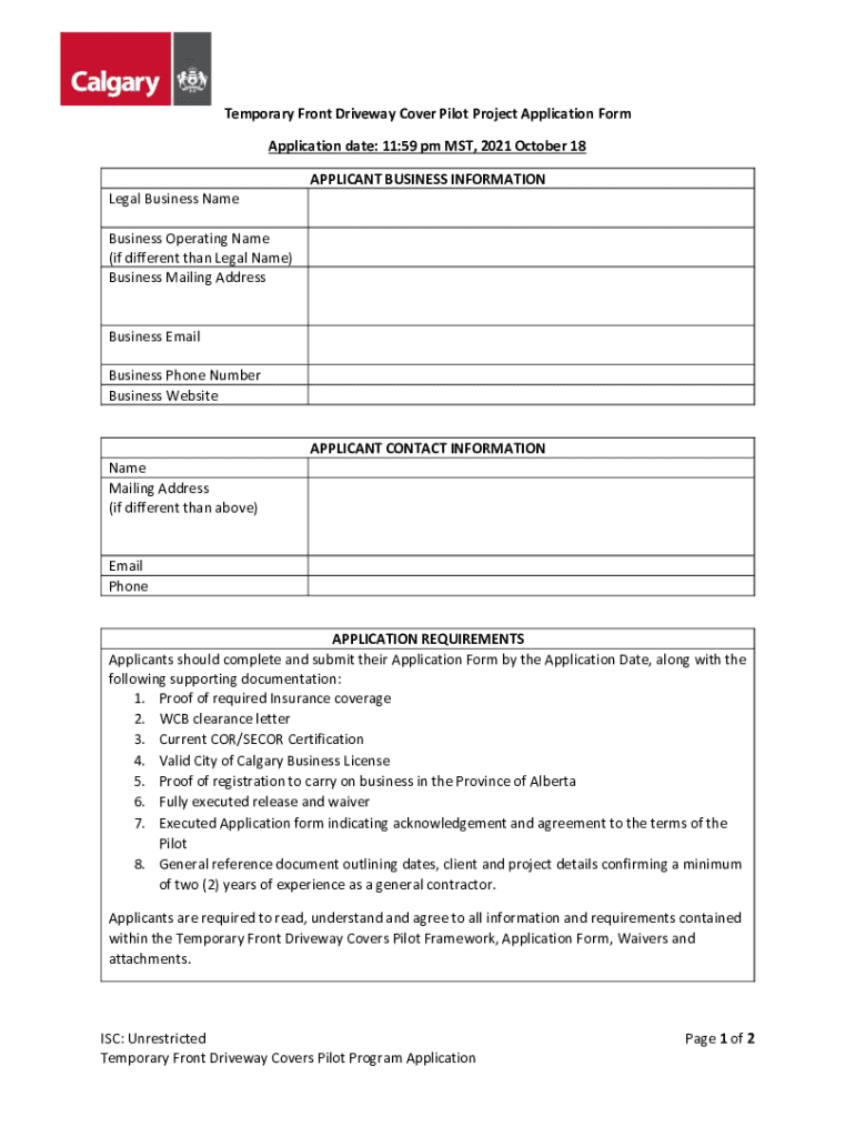 Temporary Front Driveway Cover Pilot Project Application Form Application date: 11:59 pm MST, 2021 October 18 APPLICANT BUSINESS INFORMATION Legal Business Name Business Operating Name (if different