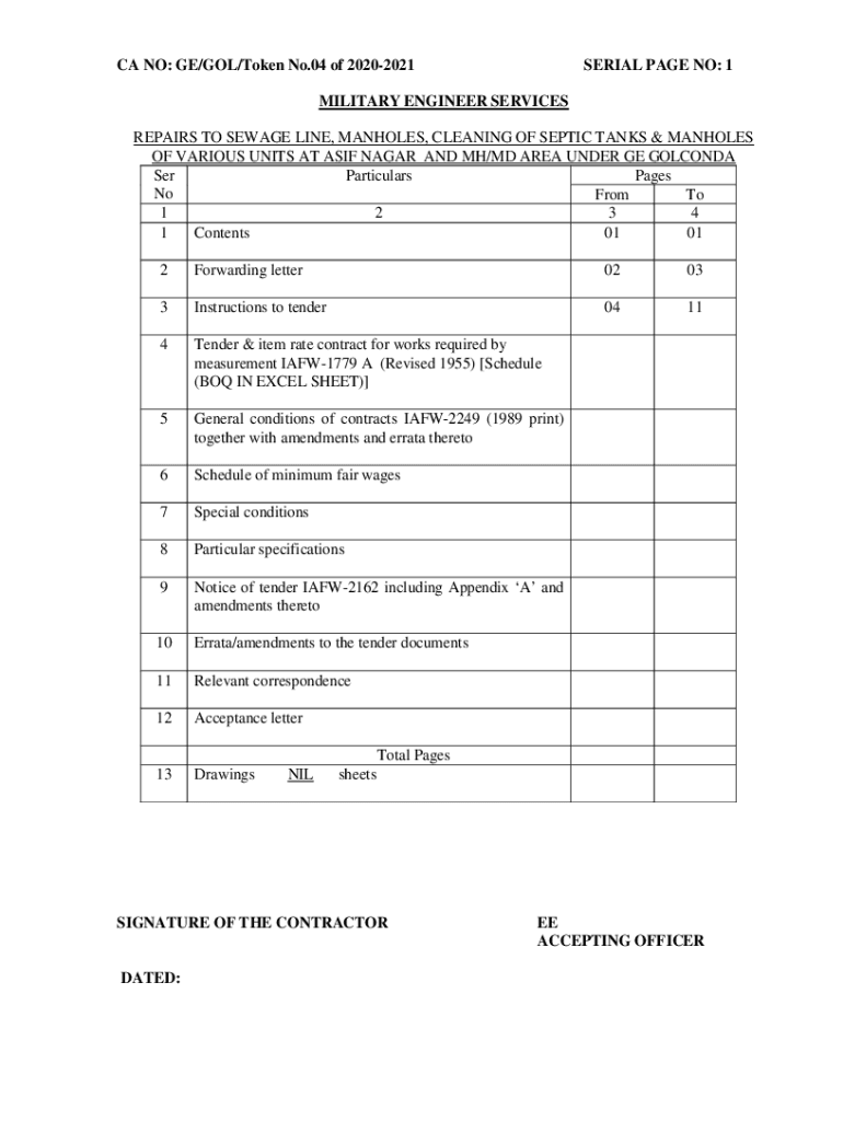 CA NO: GE/GO/Token No.04 of 20202021SERIAL PAGE NO: 1MILITARY ENGINEER SERVICES REPAIRS TO SEWAGE LINE, MANHOLES, CLEANING OF SEPTIC TANKS & MANHOLES OF VARIOUS UNITS AT ASIF NAGAR AND MH/MD AREA
