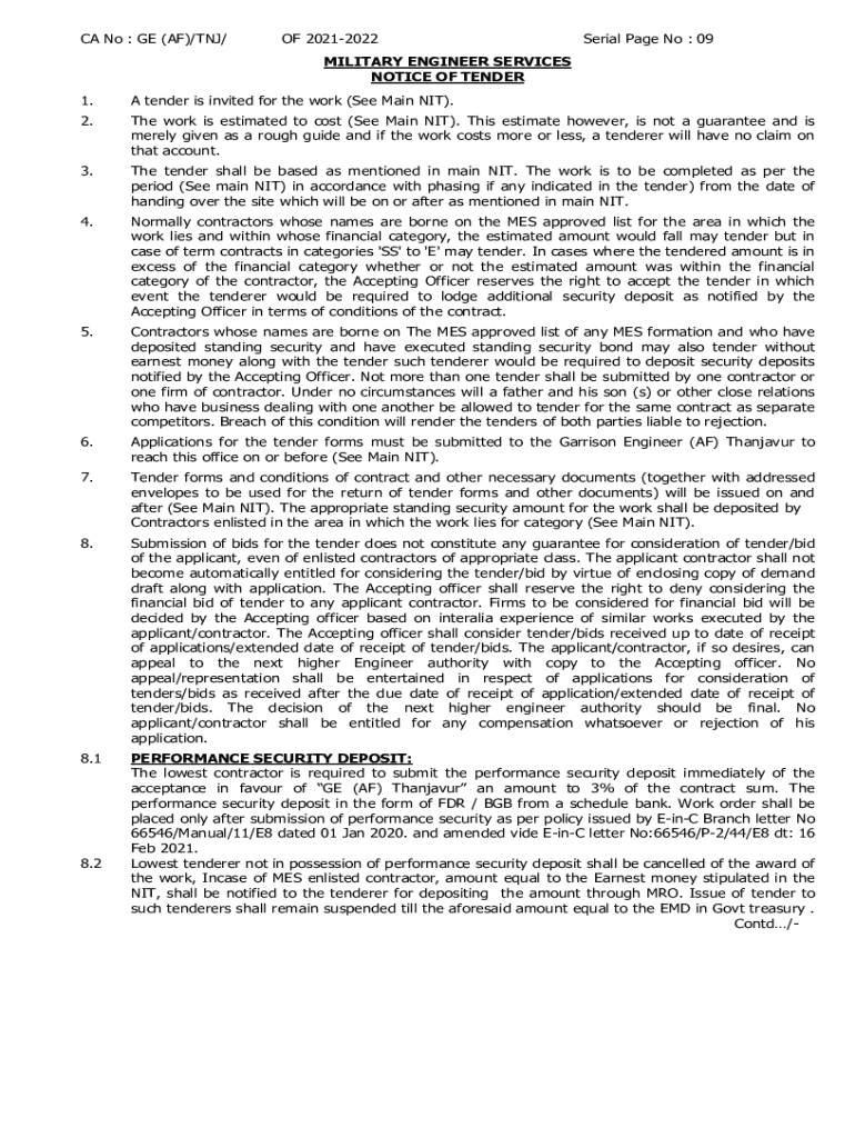 CA No : GE (AF)/TNA/OF 20212022Serial Page No : 09MILITARY ENGINEER SERVICES NOTICE OF TENDER 1. A tender is invited for the work (See Main NIT).2. The work is estimated to cost (See Main NIT). This