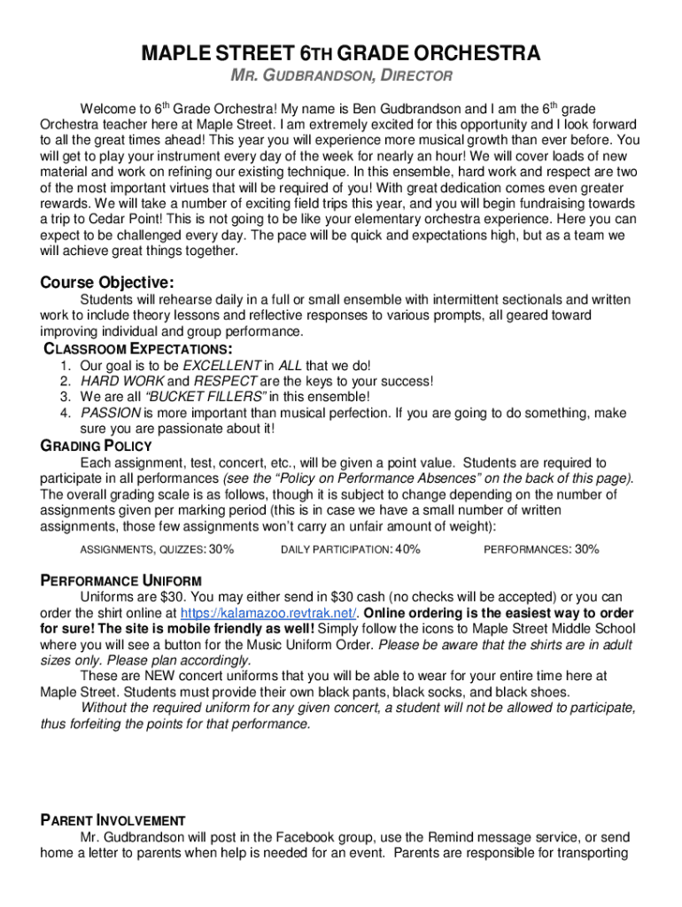 MAPLE STREET 6TH GRADE ORCHESTRA MR. GRANDSON, DIRECTOR Welcome to 6th Grade Orchestra! My name is Ben Grandson, and I am the 6th grade Orchestra teacher here at Maple Street. I am extremely excited