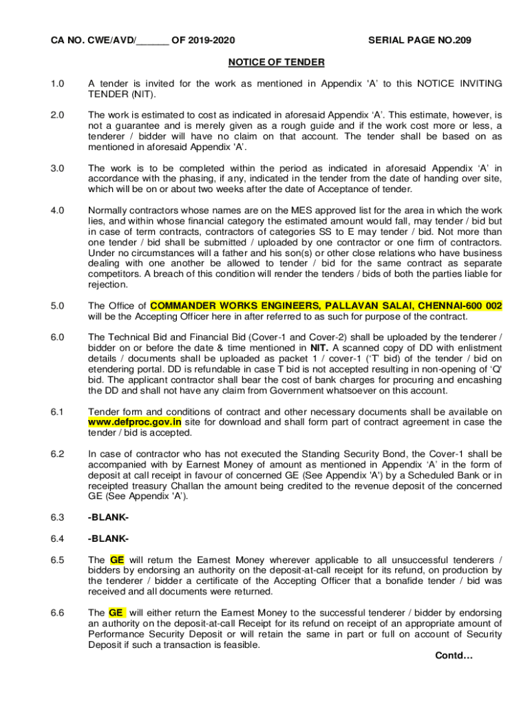 CA NO. CWE/AND/___ OF 20192020SERIAL PAGE NO.209NOTICE OF TENDER 1.0A tender is invited for the work as mentioned in Appendix \'A to this NOTICE INVITING TENDER (NIT).2.0The work is estimated to cost