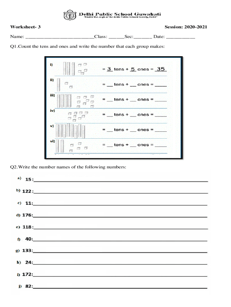 Worksheet 3Session: 20202021Name: ___Class: ___Sec:___ Date: ___ Q1. Count the tens and ones and write the number that each group makes:Q2. Write the number names of the following numbers:Worksheet