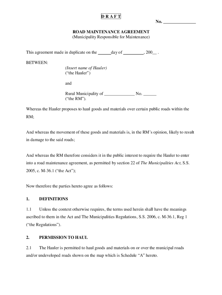 DRAFT No. ___ ROAD MAINTENANCE AGREEMENT (Municipality Responsible for Maintenance)This agreement made in duplicate on the day of, 200__.BETWEEN: (Insert name of Hauler) (the Hauler) and Rural Municipality