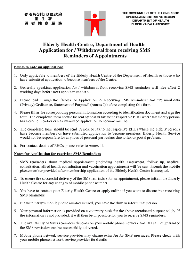 THE GOVERNMENT OF THE HONG KONG SPECIAL ADMINISTRATIVE REGION DEPARTMENT OF HEALTH ELDERLY HEALTH SERVICEElderly Health Center, Department of Health Application for / Withdrawal from receiving SMS