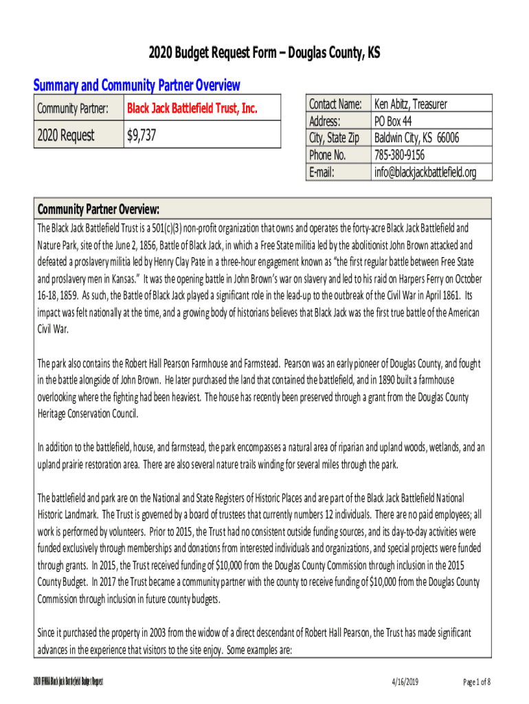 2020 Budget Request Form Douglas County, KS Summary and Community Partner Overview Community Partner:Black Jack Battlefield Trust, Inc.2020 Request$9,737Contact Name: Address: City, State Zip Phone