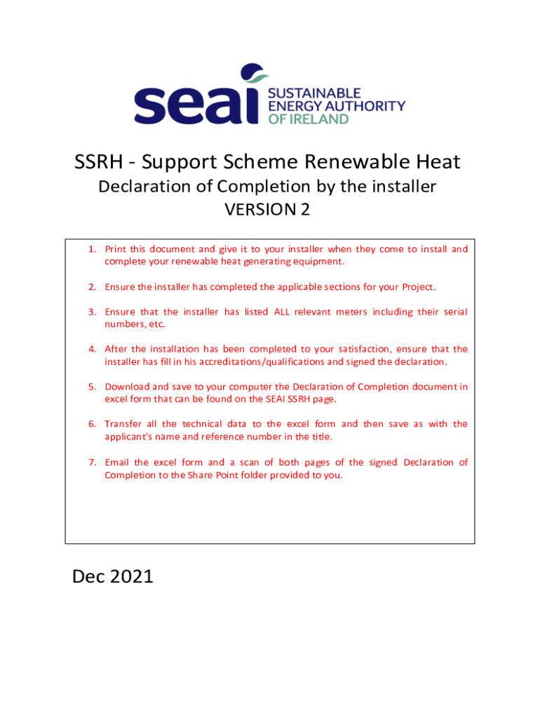 SSR Support Scheme Renewable Heat Declaration of Completion by the installer VERSION 2 1. Print this document and give it to your installer when they come to install and complete your renewable heat
