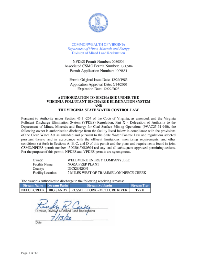 COMMONWEALTH OF VIRGINIA Department of Mines, Minerals and Energy Division of Mined Land ReclamationNPDES Permit Number: 0080504 Associated COMO Permit Number: 1300504 Permit Application Number: 1009851