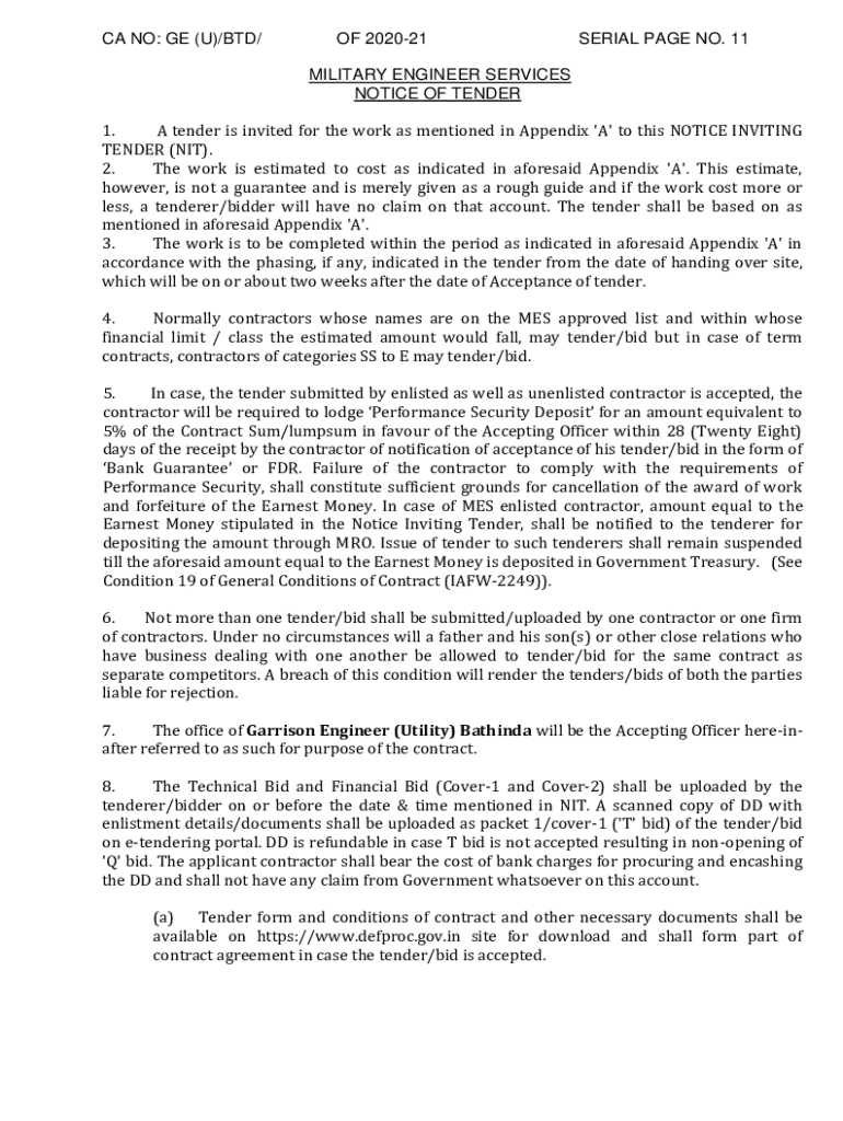 CA NO: GE (U)/BAD/OF 202021SERIAL PAGE NO. 11MILITARY ENGINEER SERVICES NOTICE OF TENDER 1. A tender is invited for the work as mentioned in Appendix \'A\' to this NOTICE INVITING TENDER (NIT). 2.
