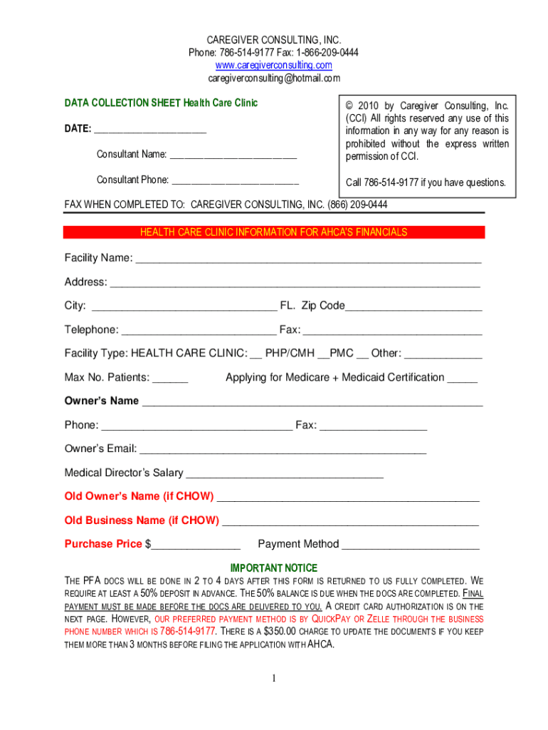 CAREGIVER CONSULTING, INC. Phone: 7865149177 Fax: 18662090444 www.caregiverconsulting.com caregiverconsulting@hotmail.com DATA COLLECTION SHEET Health Care ClinicConsultant Name: ___ 2010 by Caregiver