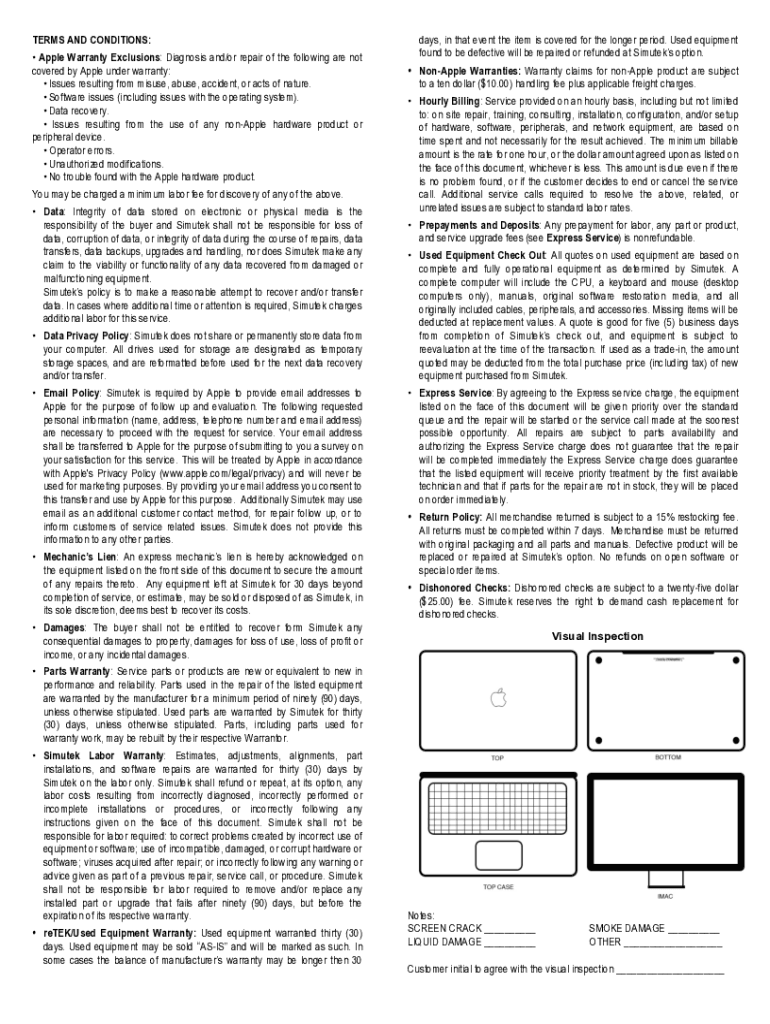 Apple Inc repair terms typically include information about warranties, repair costs, turnaround times, liability limitations, and other important details.